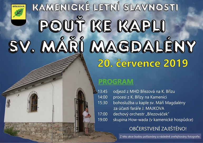 V rámci letošních Kamenických letních slavností Vás zveme na tradiční pouť ke kapli sv. Máří Magdaleny na Kamenici. Ve 13:45 hodin je plánován odjezd autobusu z MHD na Březové, který vás dopraví do Kostelní Břízy. Z Kostelní Břízy se poté procesí přesune k blízké kapli na Kamenici, kde následně od 15:00 hodin proběhne bohoslužba. Poté vás čeká kulturní program s občerstvením.