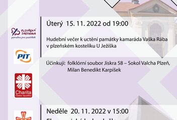 Poradna pro pozůstalé Plzeňská zastávka z.s. zve již v úterý 15.11. od 19 hodin na hudební večer k uctění památky kamaráda Vaška Rába v plzeňském kostelíku U Ježíška. Vystoupí folklorní soubor Jiskra 58 – Sokol Valcha Plzeň a Milan Benedikt Karpíšek.